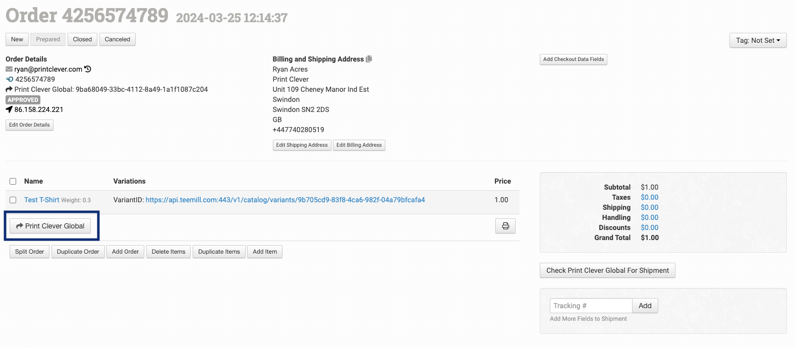 To send the order through to Print Clever click on the Print Clever Global icon. Your order will now automatically be pushed through to Print Clever for production.
