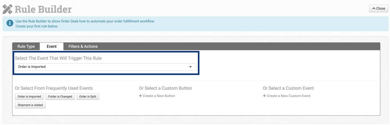 In the Event tab in the section titled Select The Event That Will Trigger This Rule, select Order is Imported.
