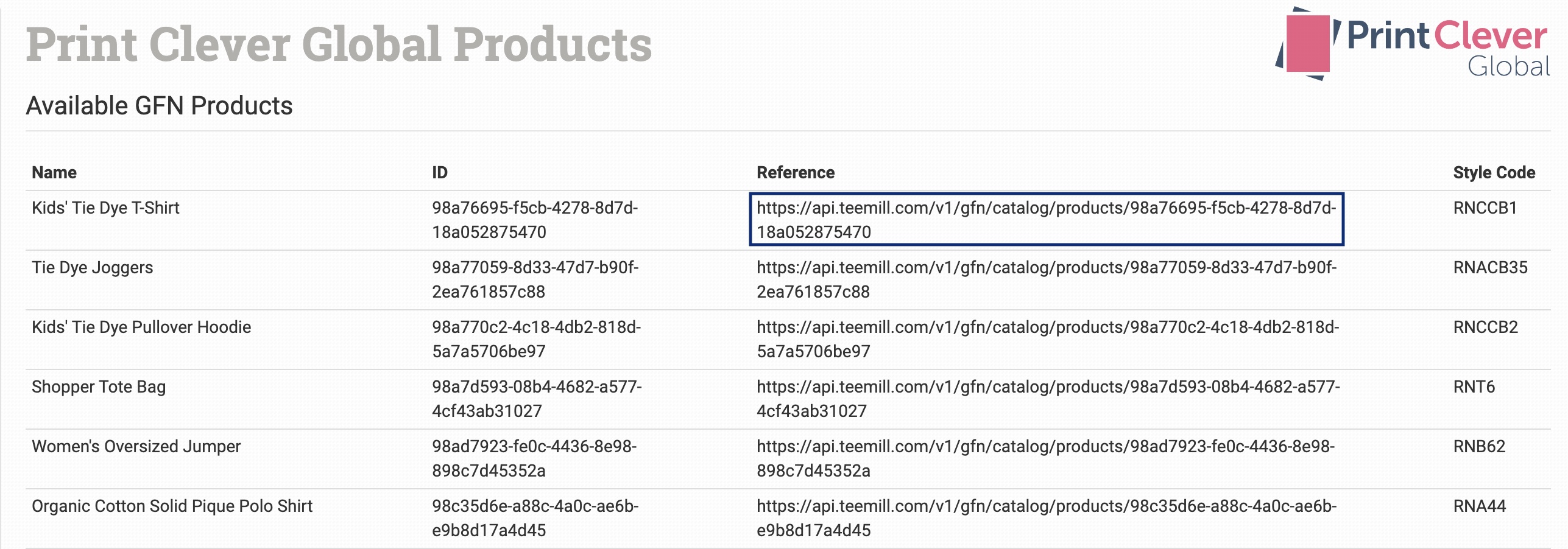 Displayed will be a list of base products on offer from Print Clever OS. Each product will have a reference field that can be used to tell Print Clever OS which product your customer has ordered.